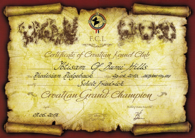 Der Kreis schließt sich… Nur einen Tag nach ihrem Erfolg in Samobor stellen wir Ibtisam bei der Ausstellung CAC Velika Gorica vor. Dabei kann sie noch einen draufsetzen. Ibti gewinnt abermals die Championklasse und mit der »Bewertung »Vorzüglich 1, CAC-HR, BOS« wird sie auch schönste Ridgebackhündin der Veranstaltung. Sie erhält ihre vierte Anwartschaft und damit den Titel »Kroatischer Grand Champion«. Wir sind soooo stolz…