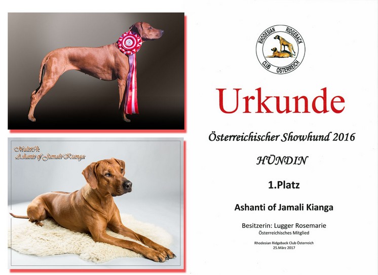 Unsere Ashanti kann die Richterin (Frau Hana Ahrens) von ihren Qualitäten überzeugen und gewinnt die Championklasse mit der Top-Beurteilung »vorzüglich 1, CACA, CACIB, Beste Hündin, BOS«. Sie erhält ihre erste Anwartschaft auf den Österreichischen GrandChampion und mit ihrer vierten Anwartschaft erfüllt sie alle erforderten Ausstellungsergebnisse für den Titel des Internationalen Champion... Wir sin soooo stolz...